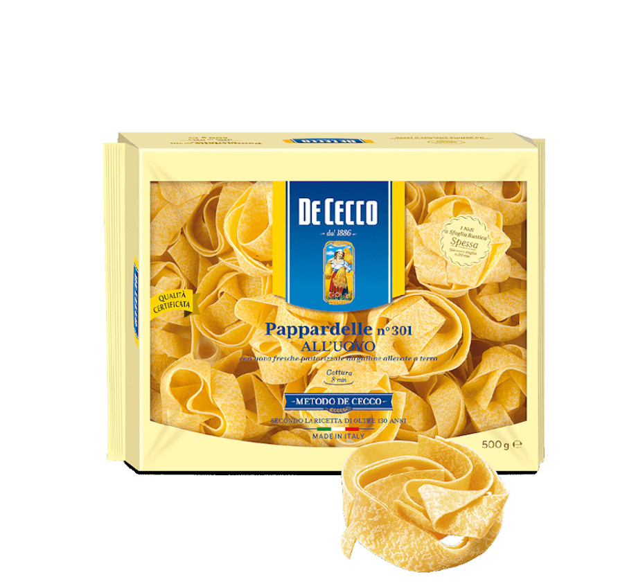 Szerokie wstążki pappardelle all’uovo uformowane w gniazda ułatwiają porcjowanie i serwis. Dzięki dodatkowi jaj makaron ma pełniejszy smak i idealnie pasuje do ragù z dziczyzny, długoduszonych sosów mięsnych i dań o charakterze rustykalnym. De Cecco – klasyczny włoski makaron suchy dla gastronomii De Cecco to jedna z najbardziej rozpoznawalnych włoskich marek makaronu, od pokoleń związana z regionem Abruzja. Do produkcji używa wysokiej jakości semoliny z pszenicy durum, wody źródlanej i – w przypadku makaronów jajecznych – świeżych jaj. Ciasto jest formowane w matrycach z brązu (trafilatura al bronzo), dzięki czemu makaron ma porowatą, lekko szorstką powierzchnię i idealnie wiąże sos. Powolne suszenie w niskiej temperaturze pozwala zachować kolor, aromat zboża i doskonałą teksturę al dente – tak oczekiwaną w profesjonalnej kuchni włoskiej.